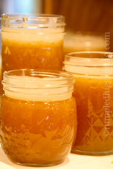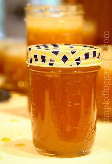 The ratio of sugar to fruit is a bit alarming- 5 1/2 cups of sugar to 4 cups of fruit puree- but hey, it’s a condiment! And I won’t be eating mouthfuls so I’m okay with it.